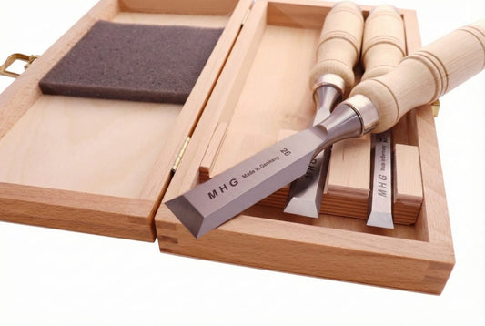 MHG Kurzbeitelsatz 3-tlg im Holzkasten, Seitenfase bis Spiegelseite, Rundheft geölt mit Zwinge, Inhalt: 12, 16, 26 mm