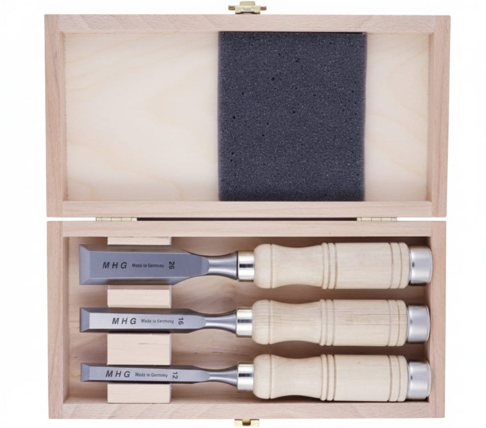 Der 3-tlg. neue Kurzbeitelsatz im hochwertigen Holzkasten ist ein ideales Werkzeug für ein exaktes Nacharbeiten von Schwalbenschwänzen und Nuten.